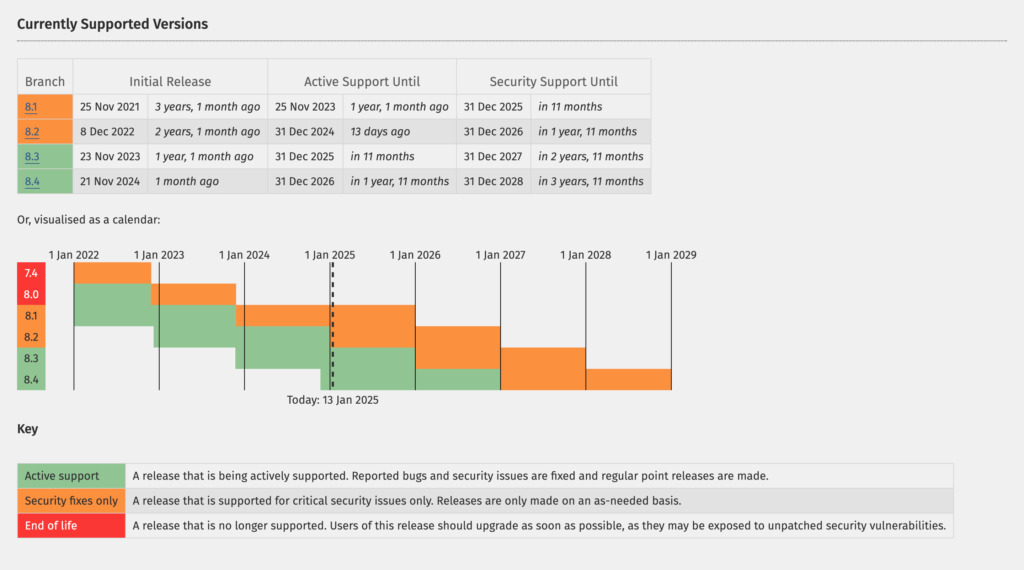 PHP 8.4 turi dvejus metus aktyvaus palaikymo ir dar dvejus metus kritinių saugumo atnaujinimų, todėl jūsų svetainė bus apsaugota nuo pagrindinių grėsmių net ilgą laiką po versijos išleidimo.
